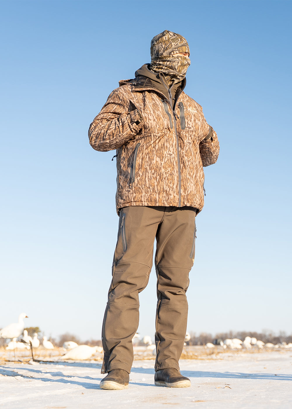 Designed for versatility in the field, they feature three zippered pockets for secure storage, an elastic back waistband for extra room, belt loops for a customizable fit, zippered knee openings for easy boot access, and a drawcord at the ankles for a snug fit.