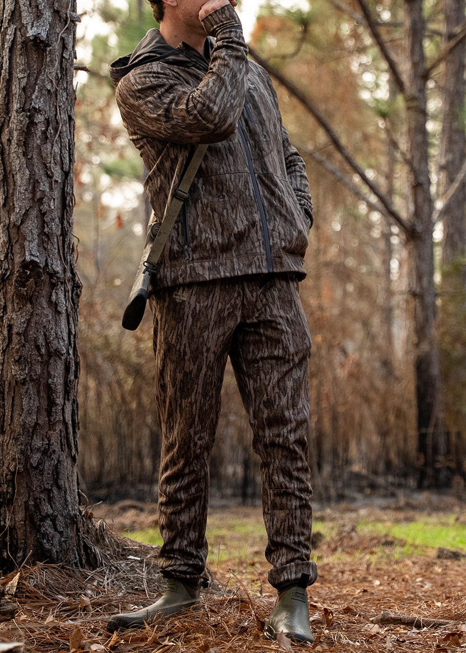 Bonded fleece fabric with Lycra ankle binding, adjustable drawstring waist, utility loop, water-resistant finish, and ultra-quiet performance for stealthy hunting.