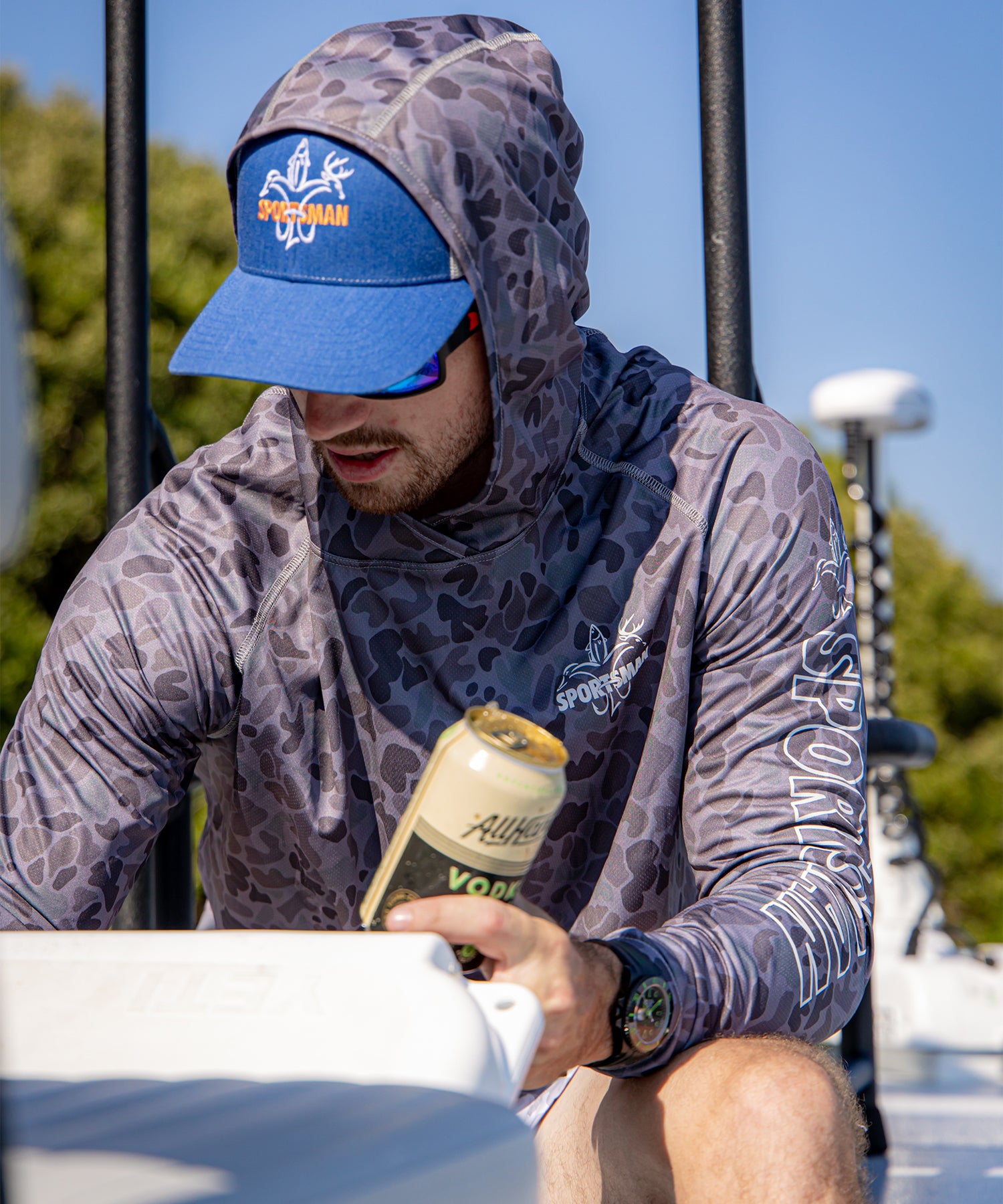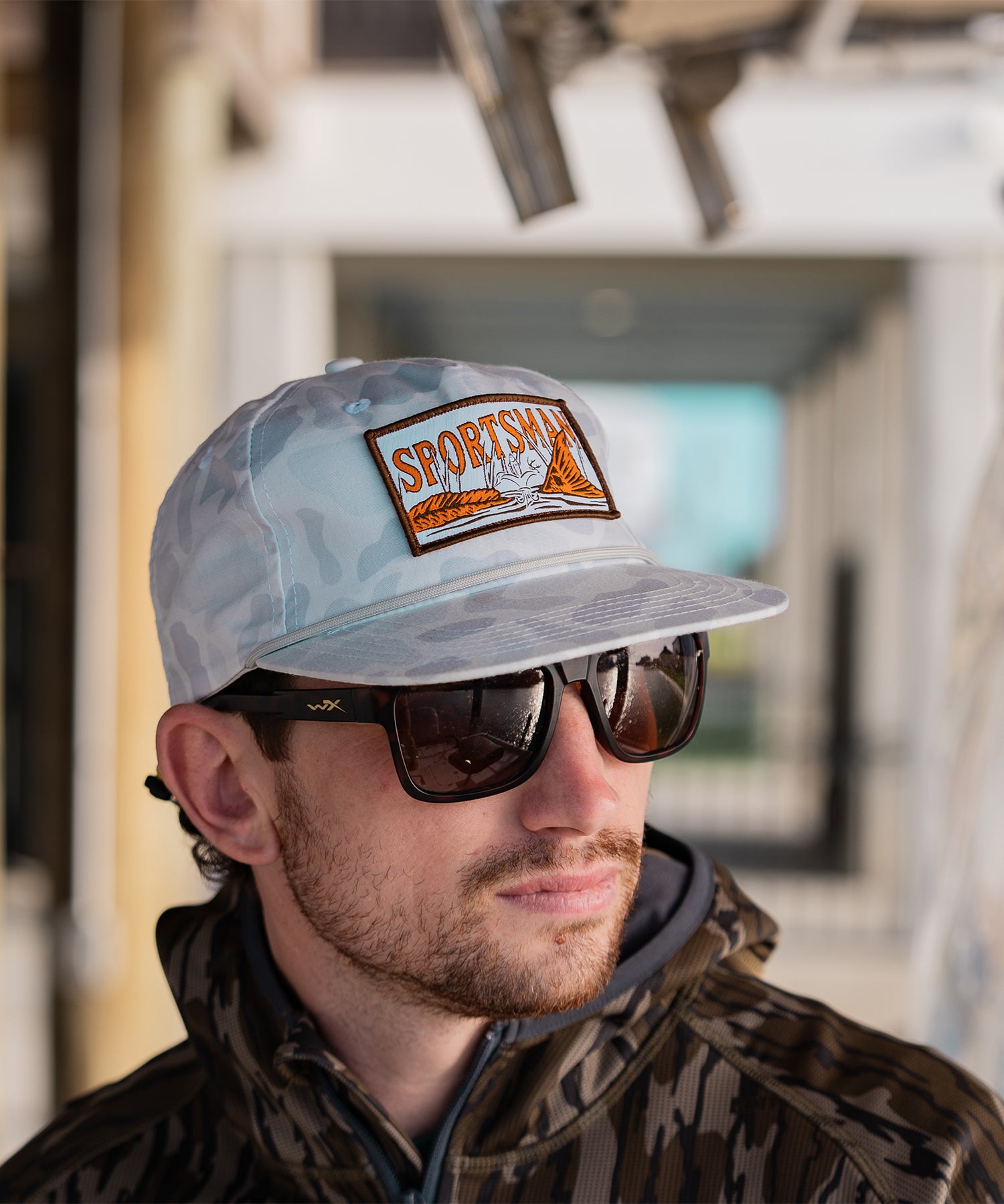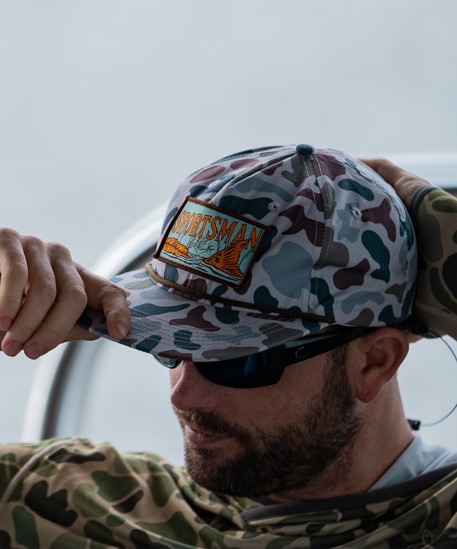 The Sportsman Camo Hat features a top quality organic cotton bill and front panel; cool polyester mesh back for increased ventilation, and adjustable snapback.